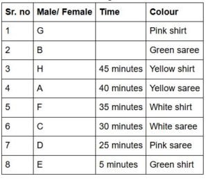 C and F wore White coloured saree and shirt, respectively. D, whose interview lasted for 25 minutes, wore Pink saree. Two interviews were scheduled between B and F. H’s interview lasted for 45 minutes. Three interview were scheduled between the interviews of A and E. A is more brilliant than E and F. H is brilliant than A but not brilliant than B. The interviews of males were not scheduled adjacently. The total time duration of C’s and E’s interview was 35 minutes. The person, whose interview lasted for 5 minutes, wore Green shirt. Neither B nor G wore Yellow colour outfit.